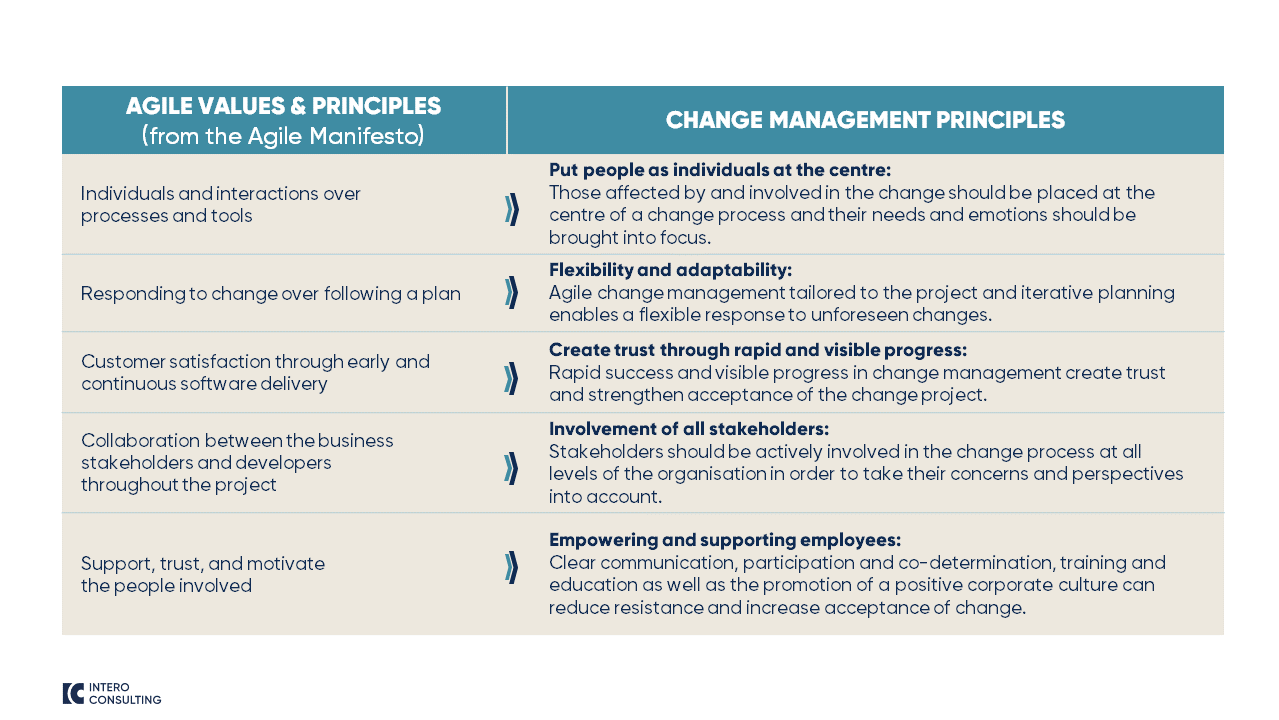 The financial services sector is one of the industries most affected by digitalisation. The growing pressure to digitalise the core business and meet regulatory requirements at the same time is influencing the role of IT as a corporate function, its organisational structure, the type of collaboration within the company and the associated process models. This results in numerous transformation projects affecting not only the IT but the entire organisation. Due to the complexity of the necessary transformation projects, banks and insurance companies are increasingly focussing on agile approaches when implementing these projects. These two factors make it necessary not only to accompany projects with active change management but also to integrate agile values and principles into change management and utilise the resulting synergy effects.