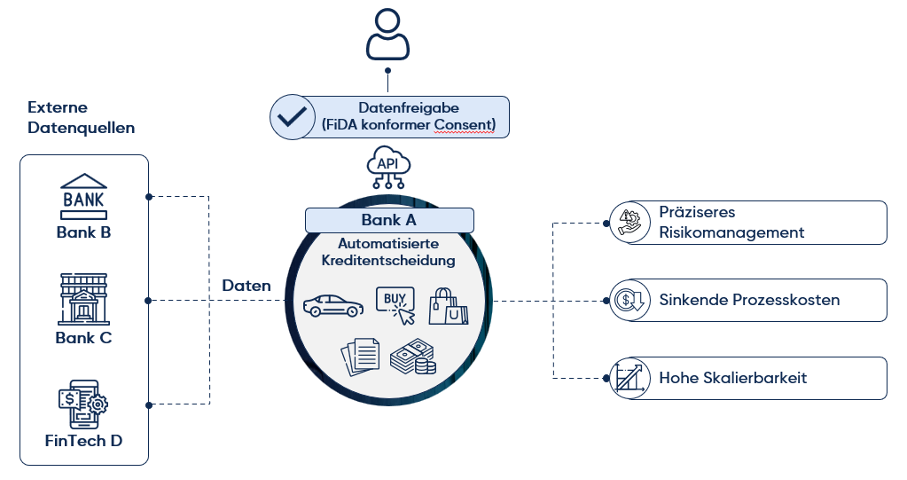 FiDA verändert zudem die Rahmenbedingungen für das Kreditgeschäft grundlegend. Zwar arbeiten Institute auch gegenwärtig bereits verstärkt mit disruptiven Technologien wie künstlicher Intelligenz, um Kreditentscheidungen zu treffen, allerdings wird diese Entwicklung unter FiDA auf ein neues Level gehoben. Banken erhalten (auch hier ausschließlich nach expliziter Zustimmung des Kunden) Zugriff auf relevante Finanzdaten des Kunden anderer Institute und Dienstleister. Auch diese Daten können nun erstmals systematisch in Echtzeit in die Kreditentscheidung integriert werden.