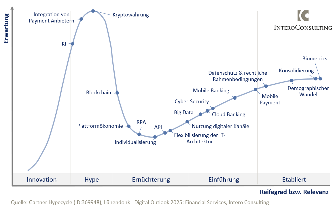 Auf Basis langjähriger Projekterfahrung mit führenden DACH-Konzernen im Finanz- und Bankensektor haben unsere Industry Experts den Intero Consulting Banking Trend Monitor (2021) entwickelt. Dieser erweitert den Gartner Hype Cycle und Lünendonk um die eigene Expertise und spiegelt die derzeitigen Trends im Bankensektor wieder. Der Trendmonitor greift die Phasen von fünf Phasen von Gartner auf: Innovationsphase, Hypephase, Ernüchterungsphase sowie Einführung und Etablierung von Trends.